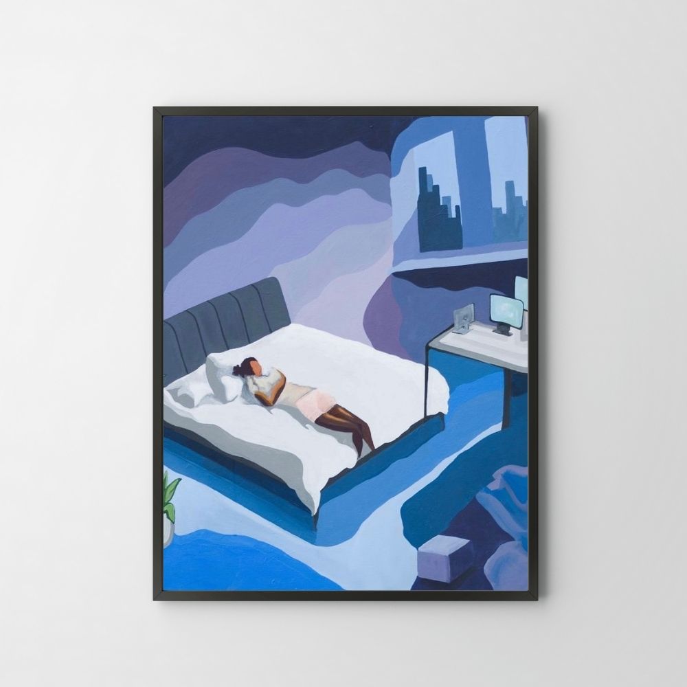 “Purple Reverie” features a dark-skinned girl lying on her bed in a room bathed in purples and blues. With wavy strokes of paint and a silhouette of a city visible through the window, this piece evokes a sense of calm and introspection. It portrays a relatable setting where one can retreat and dream, embodying the peaceful moments I cherish amidst the chaos of life.