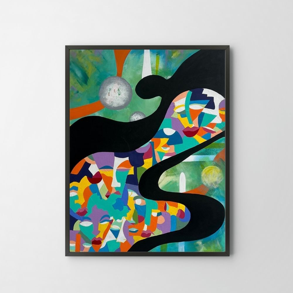“Transcendent Routes” is a vibrant, multi-layered painting that encapsulates the myriad paths one takes in life. Each layer represents different elements and experiences, interwoven in a tapestry of vivid colours. This piece symbolizes my journey through various landscapes, both literal and metaphorical, as I navigate the complexities of life as an immigrant.